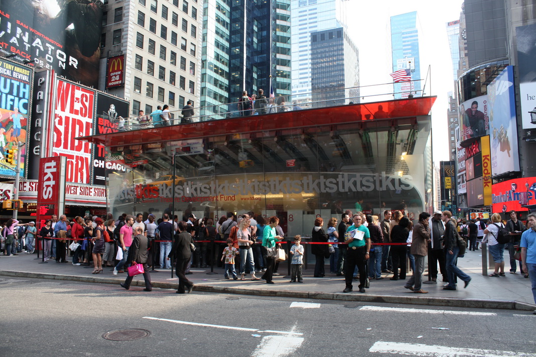 若果想保證看到心儀的演出﹐最好還是出發前在網上務百老匯的門票﹐不過網上買票要付正價不便宜。一級大制作的門票﹐在前排正中央最佳座位﹐差不多要二百美元﹐次一級也要百多美元。不過若不介意座坐偏遠﹐旨在感受一下百老匯的演出﹐後排山頂位五十美元有交易。若果對時間和看那套劇有彈性﹐不妨考慮到紐約才買票。在紐約旅遊局可以拿某些演出的半價優惠卷﹐視乎當時什麼劇目在做推廣﹐我們就是用半價坐樓下看Mamma Mia!。除了用優惠卷外﹐還可以去時代廣場的TKTK售票處碰運氣﹐下午三時開門營業﹐割價傾銷賣不去的即日門票﹐反正賤價賣總好過票劇院座位空著。一般門票以半價發售﹐有些更低至三拆﹐所以下午時段TKTK前總是人山人海﹐大家來看看執不執到便宜貨。原本只打算看一齣百老匯﹐不過有天晚上沒有節目﹐便即興走去買即日票﹐用半價坐在樓下第三行正中央看The Philanthropist﹐認真超值。