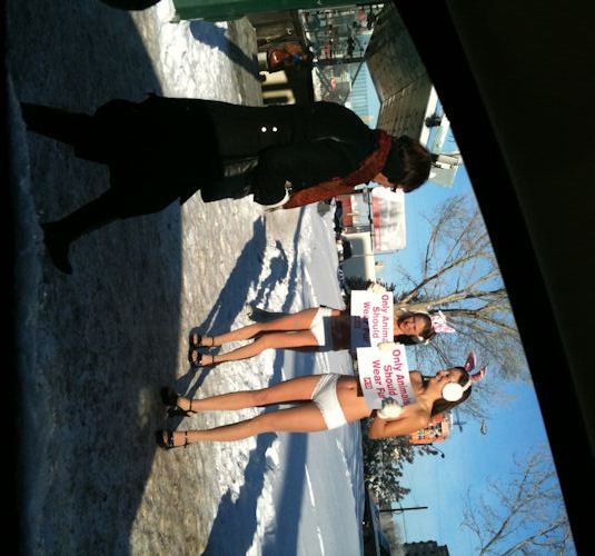 When the mercury dips below -20 C, one wouldn’t expect to find two bikini-clad protesters in downtown Edmonton. But, that was the case Monday.