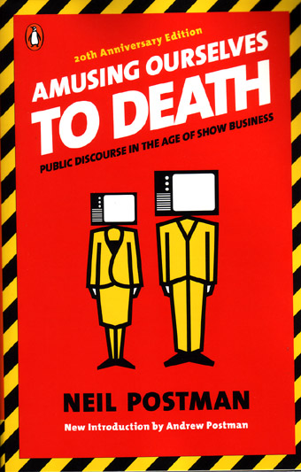 這個暑假參加了教會的避靜活動﹐在Trinity Western University過了一個週未。我對宗教活動興趣不大﹐反倒是逛大學書店時﹐發現了這本Amusing Ourselves to Death。這本書是傳理系的必讀課本﹐剛巧大學暑期班有開這門課﹐像全新一般的二手課本才賣十元﹐我二話不說便立即買下來。人家去避靜讀聖經﹐我則悄悄地在看這本經典。