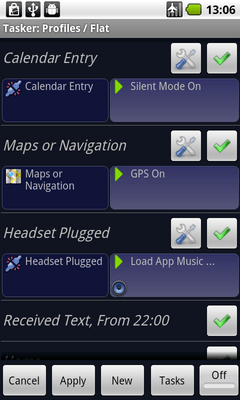 Here are example some useful scripts idea for example. The phone can read the WiFi status to figure out I am at work and turn down the ringer volume. The phone will turn off 3G data and WiFi when the screen is off to save power, yet still kick off auto-sync every 30 minutes with data connection. Whenever I plug in the headphone, the phone will pop up a menu let me select which music player to launch and auto-play the music.