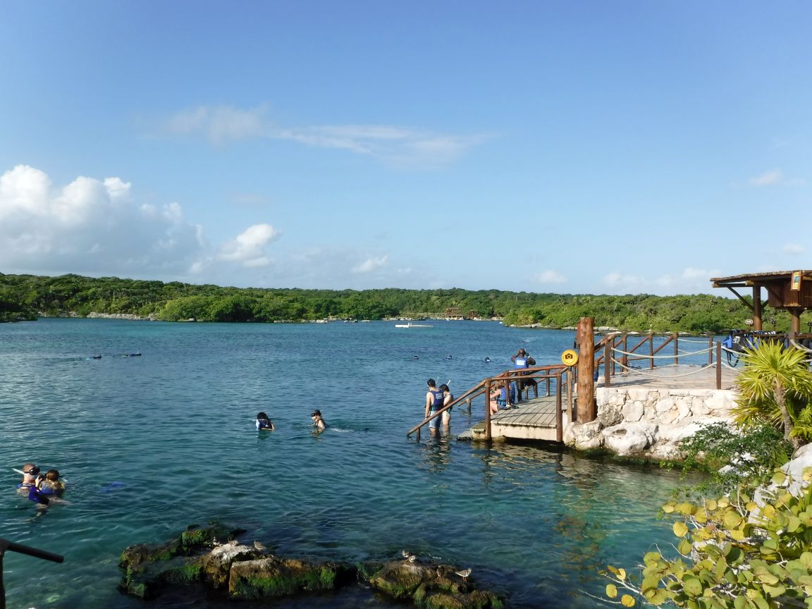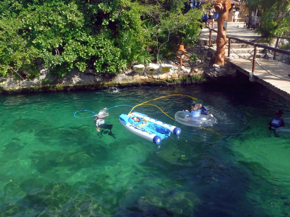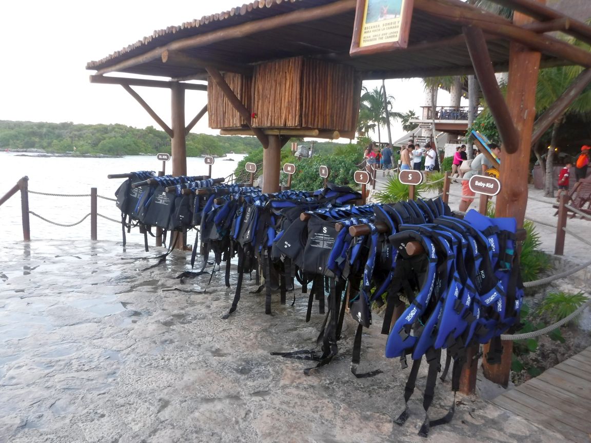 Xel-Ha園內飲食全包,自動餐很豐富,但味道比酒店差些,最重要是酒精同樣免費供應。游水潛水玩累了,上岸躺在沙灘椅或吊床上,吹吹海風嘆啤酒稍作休息,又再下水去玩。Xel-Ha的流程設計很有心思,購票入場後,先到綜合大樓,有餐廳,酒吧和更衣室。未食早餐可以先吃飽才玩,又或者點杯啤酒暖身。更衣室設有有儲物櫃,可以存放銀包電話和乾淨衣服。因為中間會有陸上活動的時間,在泳衣外記得穿T恤和短褲和著拖鞋或水鞋。那下水時身上的衣物點算,這就是Xel-Ha細心的地方,詳情下面會揭曉。換好了衫,第一件事去玩漂流河,那是條天然的真河,不是人工建造假河。從海灣出發去河的上游有三個選擇,步行要四十分鐘,踏單車要二十分鐘,坐火車要十分鐘。在上游起點可以把身上的衣物鎖入布袋,有專人替你把布袋運到海灣,在終點的更衣室取回。拿了蛙鞋浮潛眼鏡和呼吸管,坐著大水泡出發源流。沿途景色優美,人工的漂流河無法比擬。很悠哉游哉地漂了三十分鐘,便到一系列好玩的水上活動,如懸涯跳水,水上Zipline等。可以暫時靠岸放下水泡,盡情玩過夠才繼續上路,漂流到於海灣的終點交回水泡,可以上岸取回衣物吃午餐,又或者在海灣中浮潛暢泳。