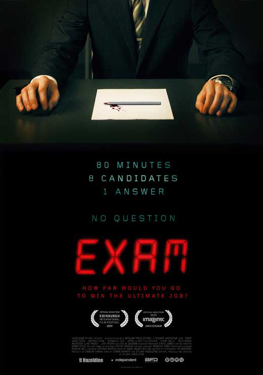 故事劇情在此我不便洩露﹐這種電影知道了結局便不好看。電影的佈局不俗但算不上很嚴緊﹐借用軟科幻元素去扭橋﹐可以想像是Saw加The Apprantice的混合版﹐但沒有Saw那樣露骨的暴力鏡頭。八十分鐘的考試時間﹐與電影實時進行﹐從開始到最後解開答案﹐一氣呵成沒有冷場。美中不足之處﹐是劇中角色欠缺鮮明性格﹐反正角色連名字也沒有﹐只是用膚色或頭髮顏色作為代號﹐把角色身份隨意互換也可以﹐自然也不能期望有什麼描寫了。