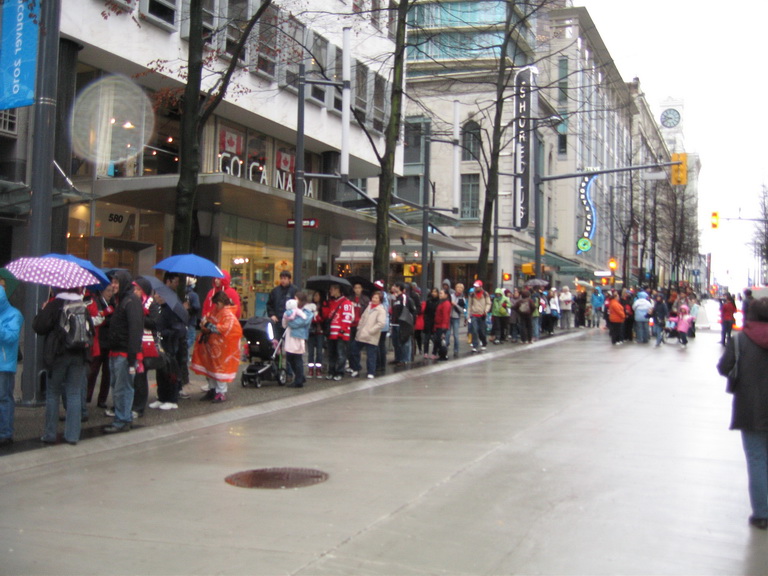 The line up is very very long. The pavilion opens at 9:00a, but when we arrive at 8:30a the line up is already one block away. I was told the person at the head of line was waiting there since 6:00a. The line is moving very slow because they only let 20 people into the medal room every 10 minutes. Since everyone in line has the Olympic mood and start chatting with each other. For the next 5 hours, I talked with two grannies, two young guys living on the West side, a mother with 2 teenage kids, a couple from HK and a lady with her dad. It is pretty interesting to hear different perspectives about the Olympic and Vancouver. It is the longest wait I ever have. I never know I can be this patient. Luckily, we can take turns go to the washroom and get coffee from the near by Starbucks. To my surprise, all the strangers I talked to are local Vancouver folks, except one family from White Rock, which is only 2 hours drive away. I wonder where all the tourist is. Maybe they are too busy watching the games and don’t bother lining up for the free shows.